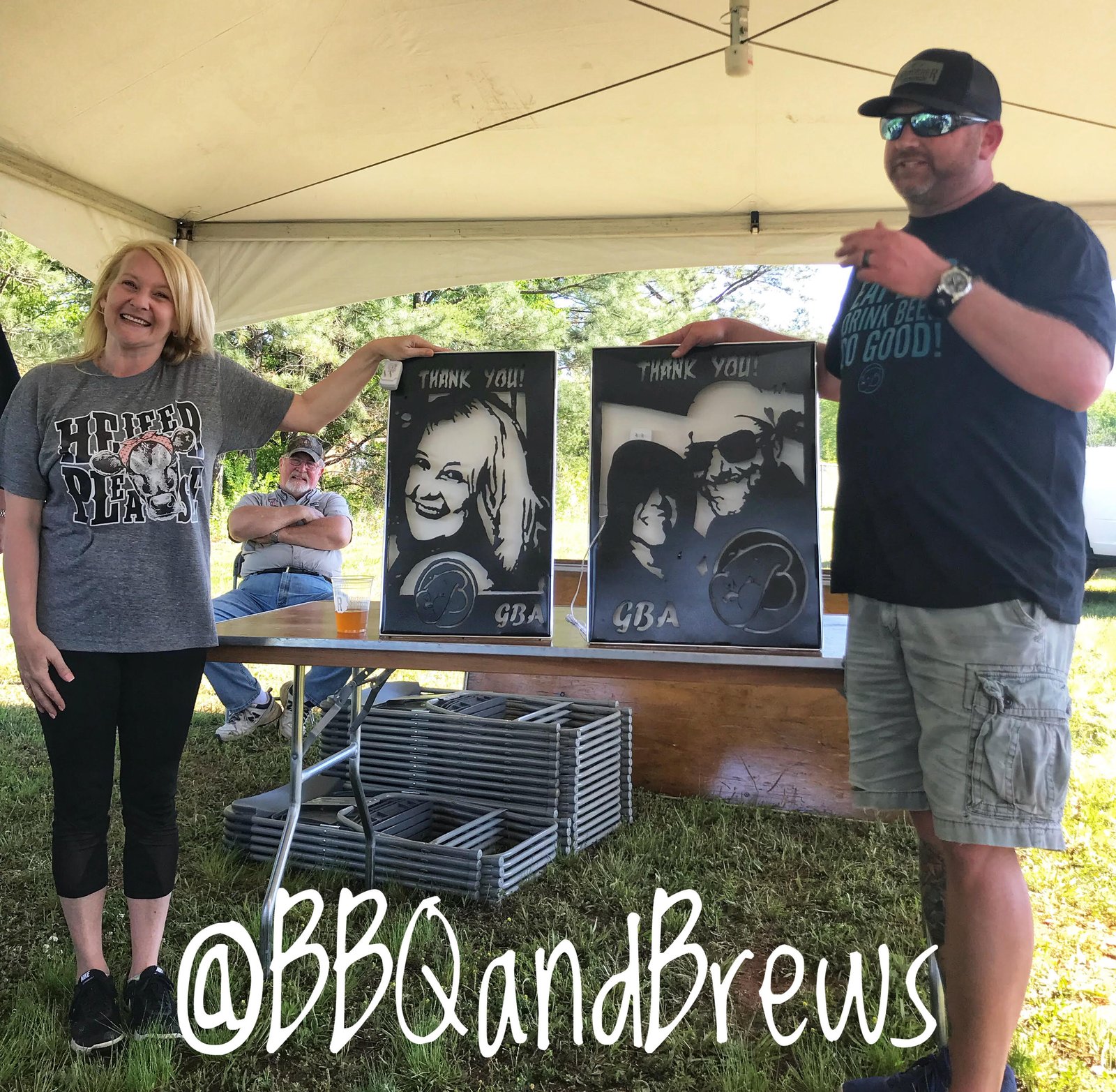Dale Wilson, owner of Pirate 50 Custom Artwork and Trophies (and creator of some of the best GBA trophies) surprised BBQ & Brews’ Gary Lamb and Kristen Cash-Raines with their own trophy replicas.